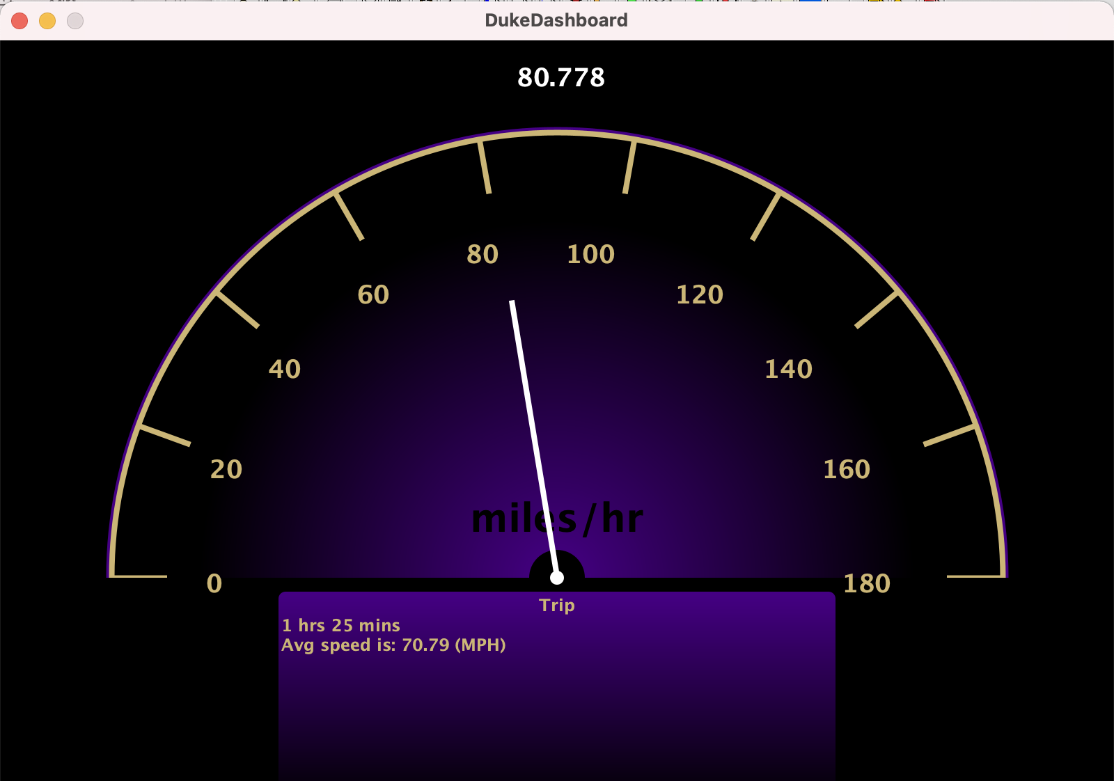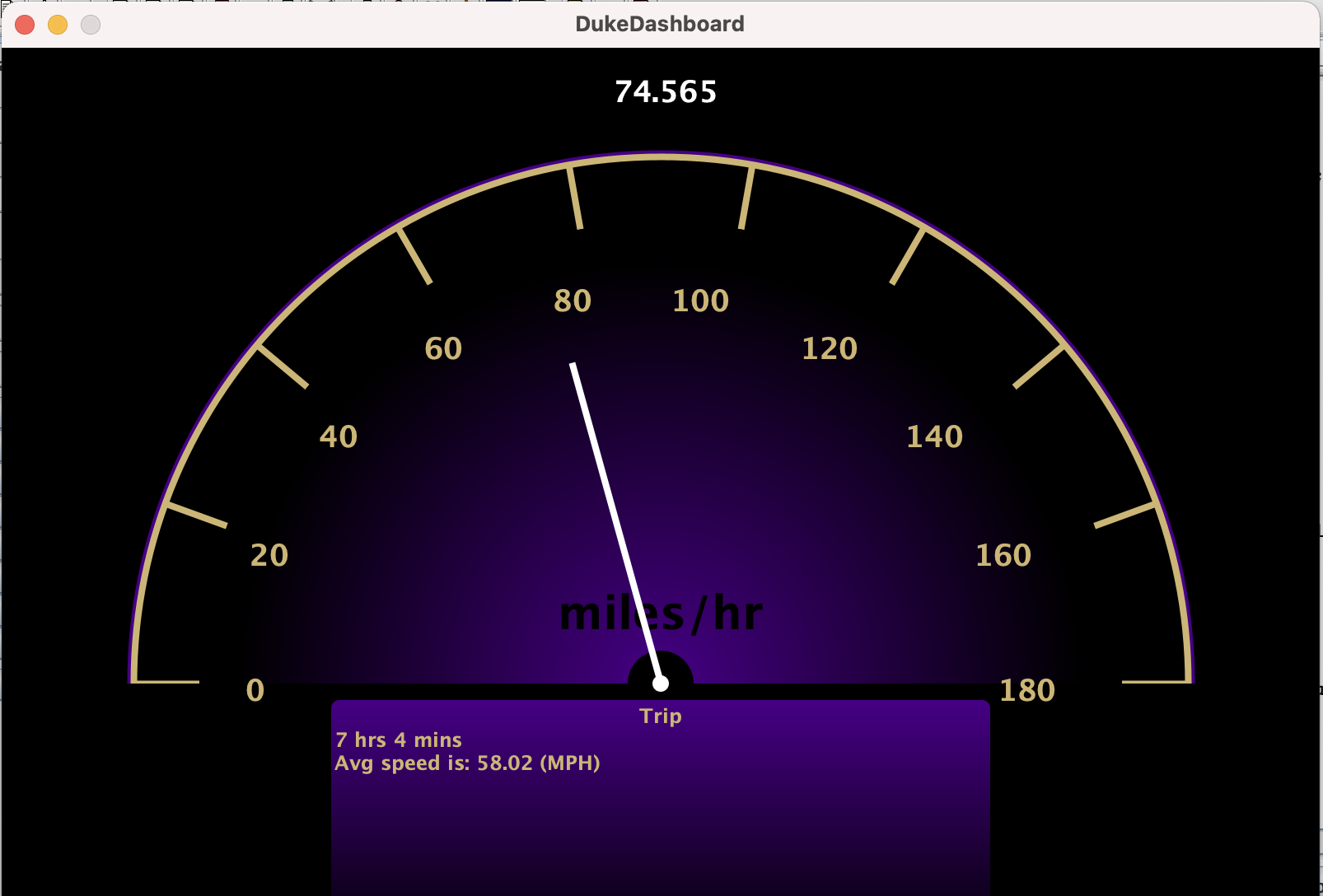 - The speedometer also displays the average speed (in MPH) and the trip duration (express in hours and minutes). You must compute these values and then call setTripInfo to update the information on the speedometer. Note that this method takes a String for the speed information and that the String should be exactly 6 positions in length and have 2 positions to the right of the decimal point. You do not need to worry about speeds greater than 999.99 MPH.