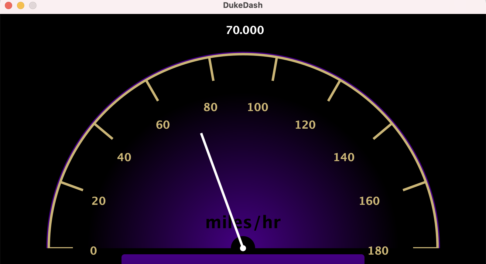 - Dashboard.class - This class provides the visual display of the speedometer. It has 2 methods that you will utilize for this PA: